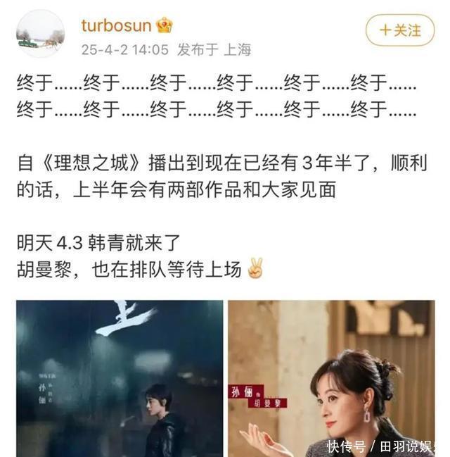 此前報談,4月2日下晝,孫儷在微博連發12個“終于……”抒發對新劇開播的原意之情。孫儷提到,自2021年的《理思之城》之后,我方照舊有三年半沒與電視不雅眾碰面,“4月3日,韓青就來了,胡曼黎也在列隊恭候上場。”
